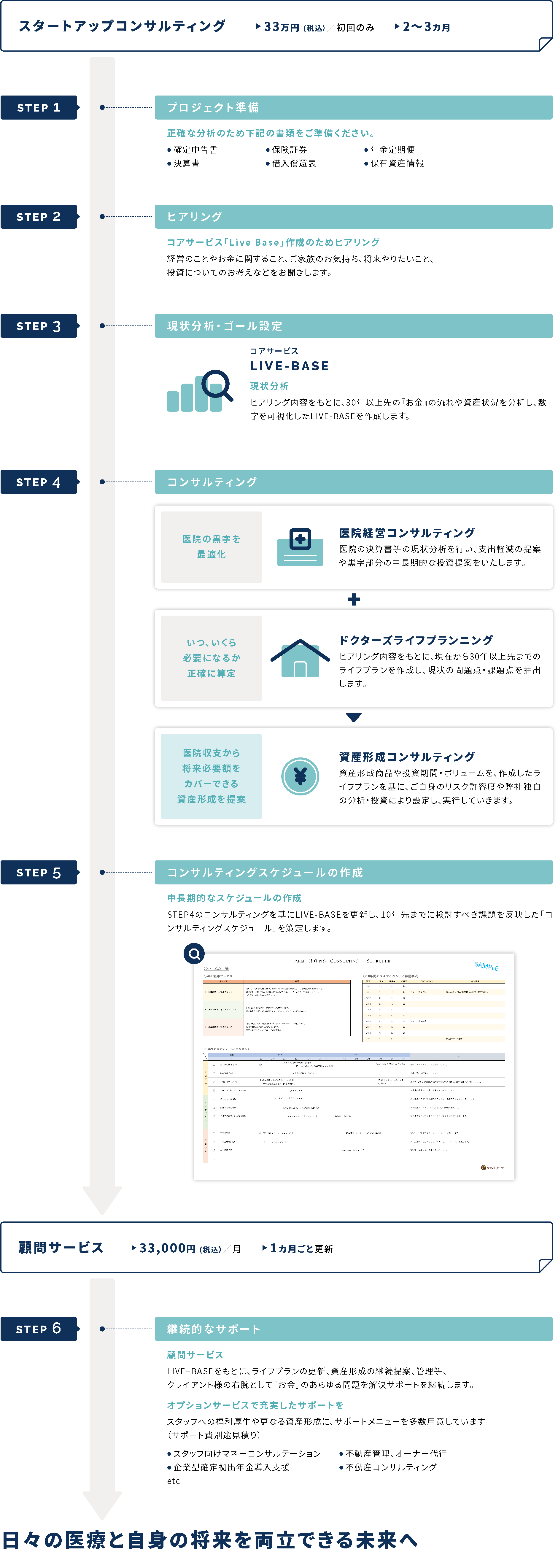 医院経営から個人のライフプラン、将来の資産形成までの「お金」の流れを、まとめてプロデュースします。まずは人生の基盤となるLIVE-BASEを時間をかけて構築し、経営と人生のステージにあわせた目的別の計画を策定します。